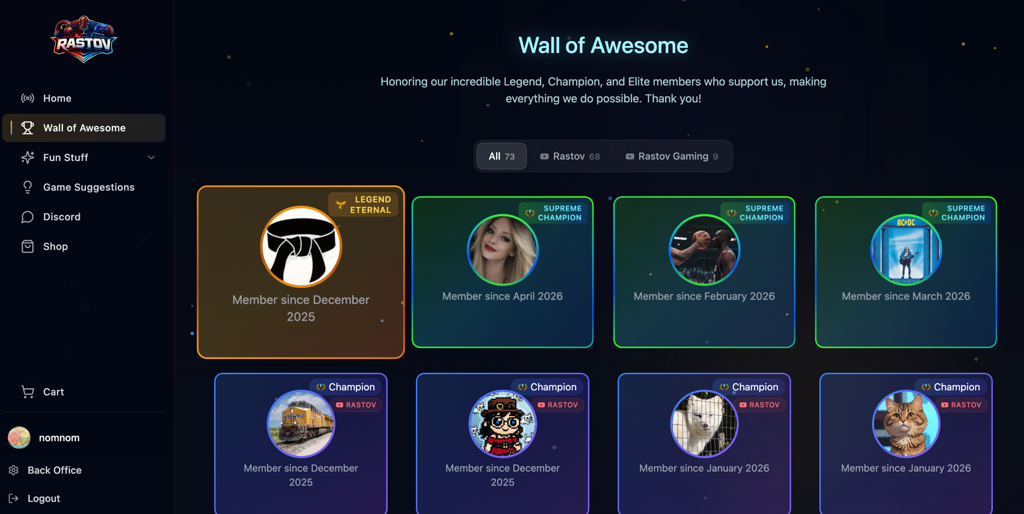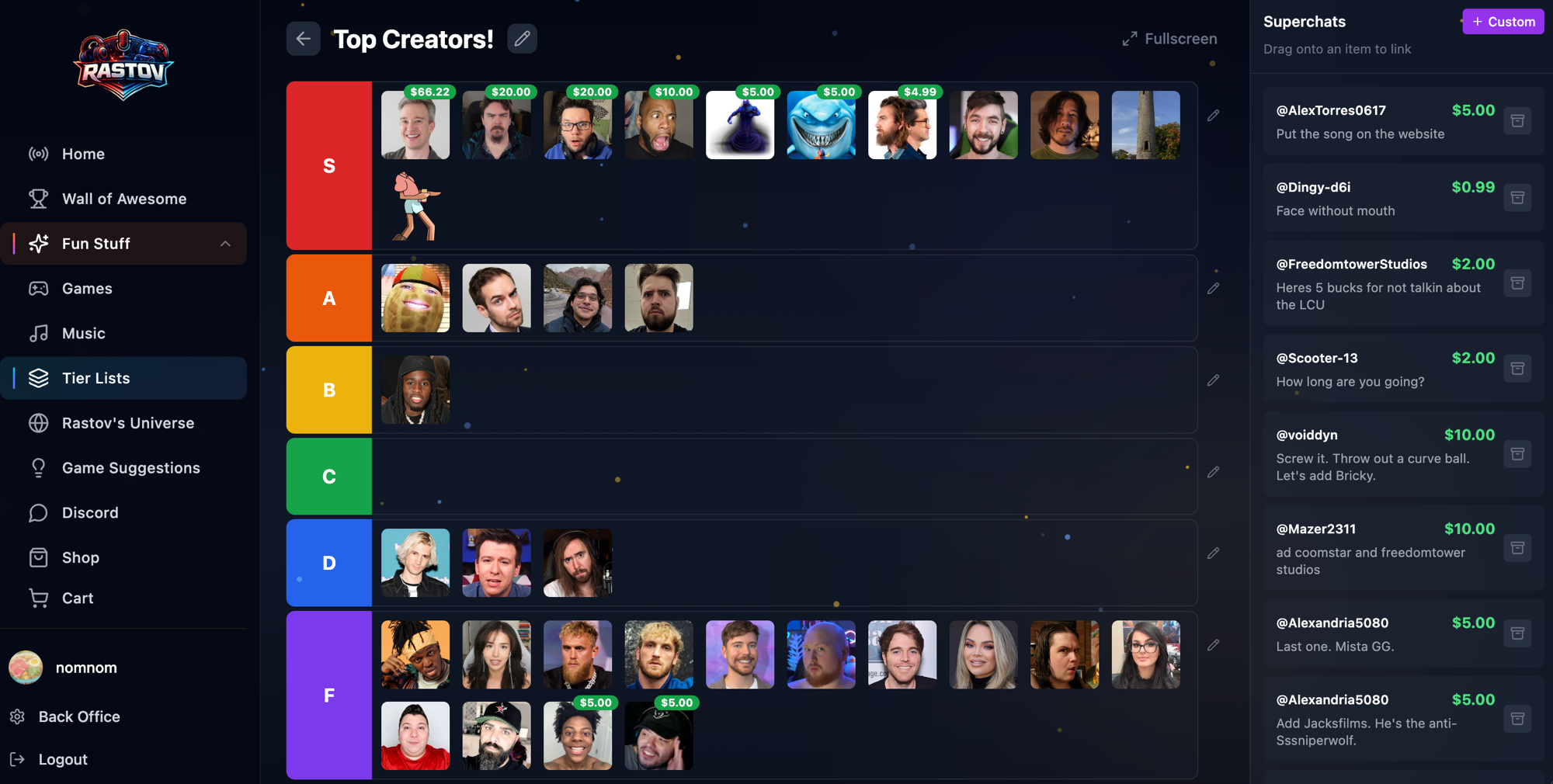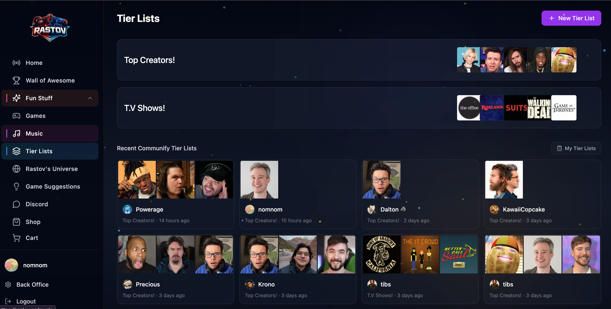 Full-stack community platform for a streamer — interactive games, live tier lists with superchat integration, music player, merch shop, Discord hub with AI summaries, and more.