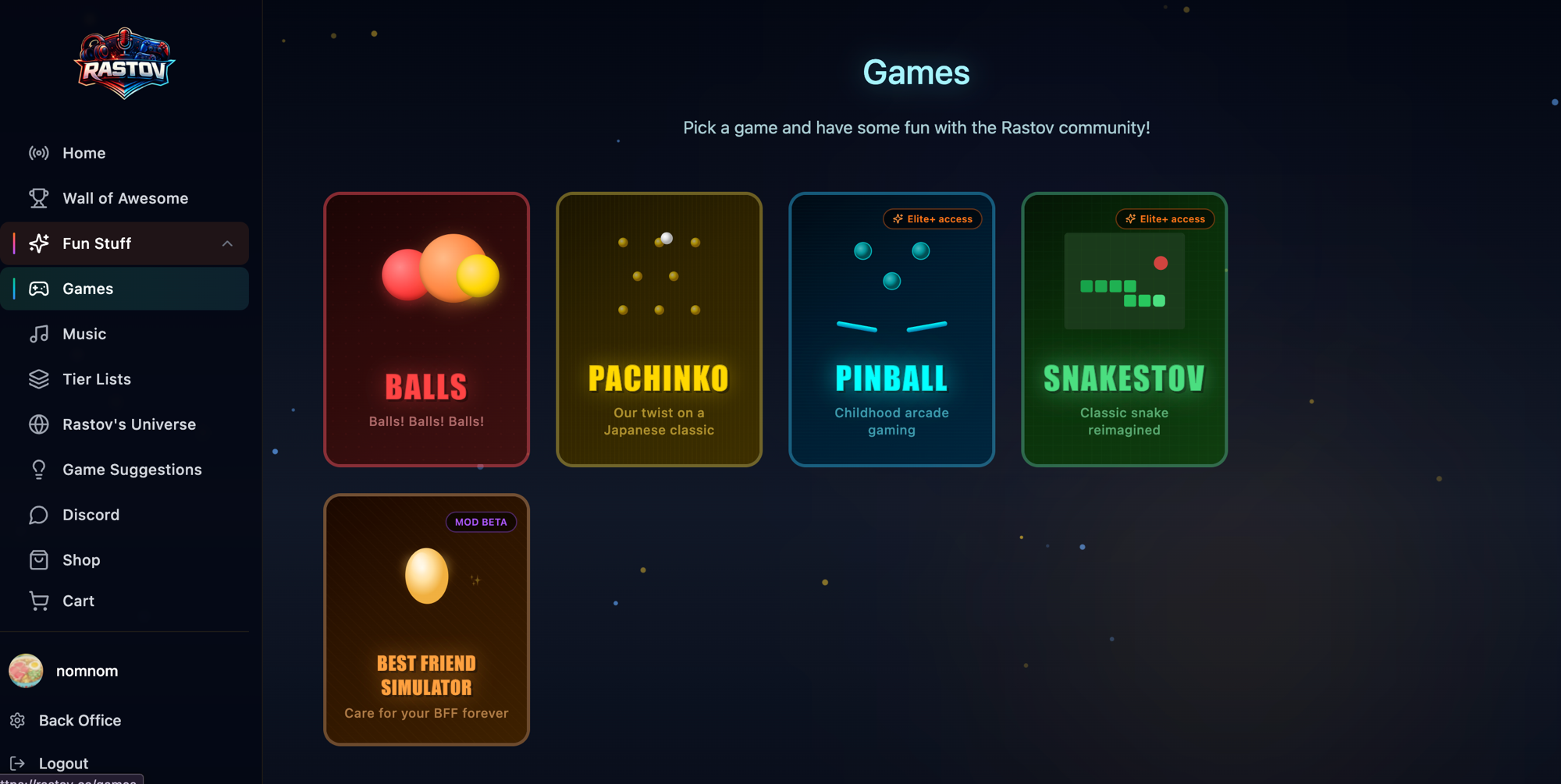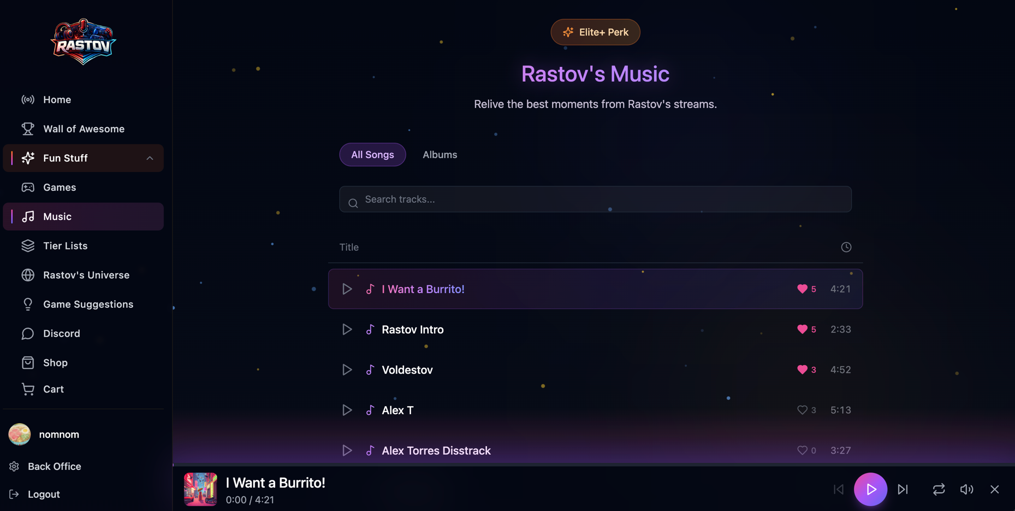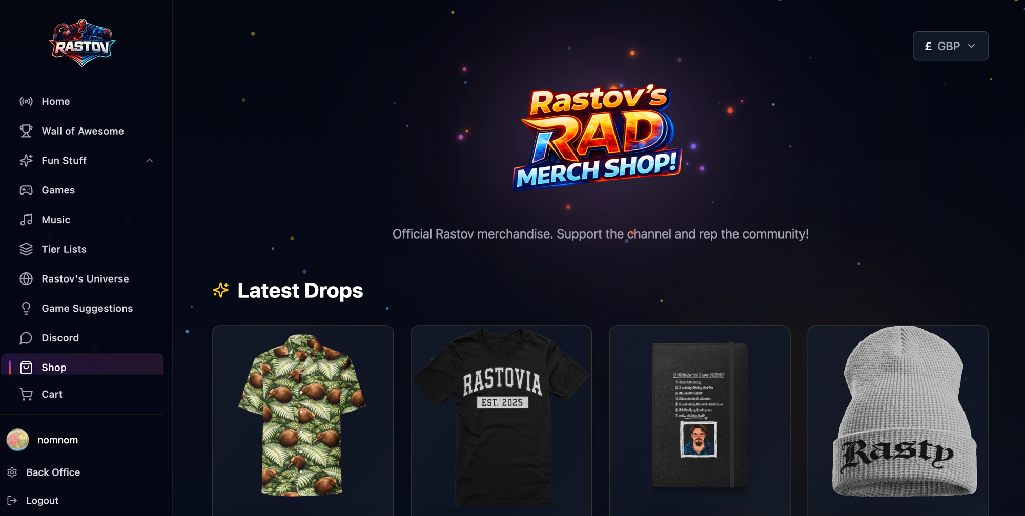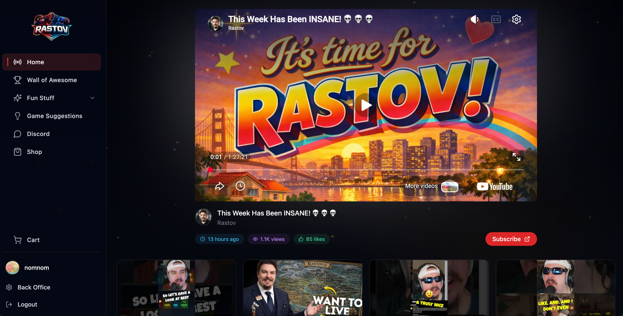 Full-stack community platform for a streamer — interactive games, live tier lists with superchat integration, music player, merch shop, Discord hub with AI summaries, and more.